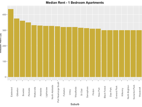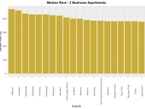The following charts show the top suburbs by median rent for apartments. The median rent for apartments across metropolitan Adelaide is $325.