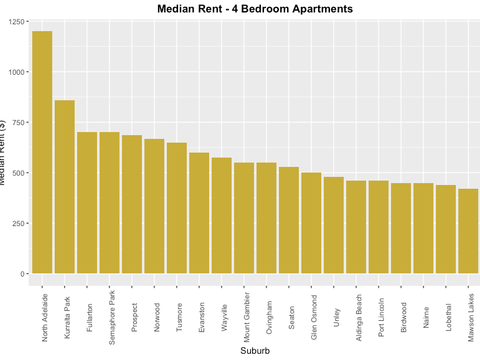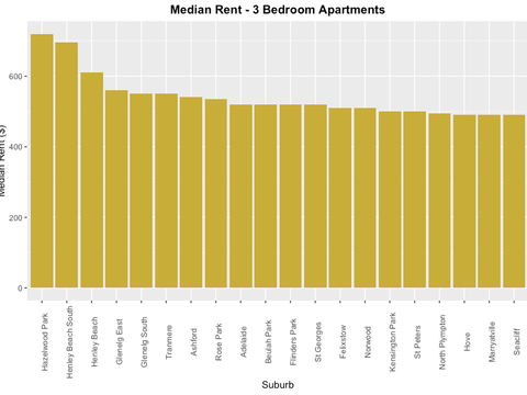 For larger apartments, the top median rents can be found in beachside suburbs (Glenelg, Henley Beach) and Adelaide's eastern suburbs (Walkerville, Hazelwood Park).