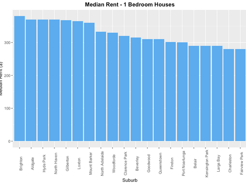 The charts below show the top suburbs by median rent for houses. The median rent for houses in metropolitan Adelaide is $380.